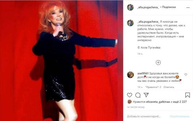 Известная российская певица Алла Пугачева растрогала поклонников, показав архивный снимок Фото появилось на странице одной из фан-групп Примадоны в Инстаграм, передает Politeka. На снимке певица одета в черное короткое платье, открывающее стройные ноги Аллы, в руках у нее микрофон, из чего можно сделать вывод, что на кадра запечатлено одно из многочисленных выступлений певицы.