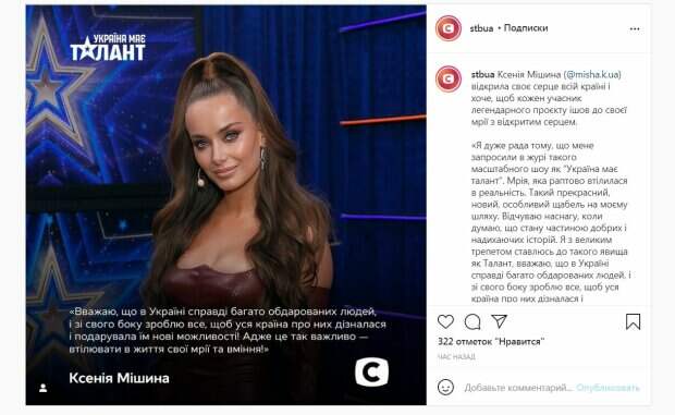 Так, по словам красотки, каждый участник "Україна має талант" должен идти к своей мечте, а сама она рада принимать участие в съемках легендарного проекта. "Чувствую воодушевление, когда думаю, что стану частью добрых и вдохновляющих историй", - поделилась Ксения своими впечатлениями от проекта. Актриса сообщила, что с трепетом относится к талантам других. "Считаю, что в Украине действительно много одаренных людей, и со своей стороны сделаю все, чтобы вся страна их узнала и подарила им новые возможности!", - подчеркнула Мишина. Также звезда добавила, что новый состав жюри, ведущий и впечатляющие таланты сделают проект феерическим. За час публикация собрала сотни лайков и немного комментариев. "Моя любимая актриса. Ксения очень талантливая и хорошо, что она будет в жюри", - написала одна из пользовательниц сети. Отметим, шоу "Україна має талант" должно выйти уже этой осенью. Напомним, что "холостячка" Мишина обтянула идеальную фигуру кожаным платьем Как сообщала Politeka, у Мишиной на свадьбе пытались вырвать букет невесты, появилось видео Также Politeka писала, что Ксения Мишина показала, в какой квартире и с кем живет