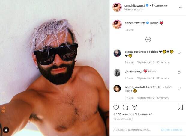 Лицо звезда решил спрятать за массивными солнцезащитными очками. В подписи артист сообщил всех фанатам, что вернулся домой после отпуска в горах. Пользователи сети уже отреагировали на новое фото. «Надеюсь, вы отлично провели отпуск 🥰❤️😍🔥», «Красиво загорел от солнца в горах», - пишут в комментариях. До этого мы писали, что на днях Том Нойвирт удивил всех изменением своей внешности. На новом фото, он позировал с идеально уложенными длинными волосами, которые закрывали часть лица. А глаза подчеркнуты ярким макияжем и накладными ресницами. Многие решили, что артист вернулся к образу Кончиты Вурст, который и прославил его на «Евровидении». Напомним, звезда "Евровидения" Кончита Вурст показала, как выглядит с утра: "Огонь". Как сообщала Politeka, раздетая звезда "Евровидения" Кончита Вурс показала себя после смены внешности: "Мой идеал". Также Politeka писала, что победительница "Евровидения" Кончита Вурст потрясла изменениями во внешности: "Барби-парень"