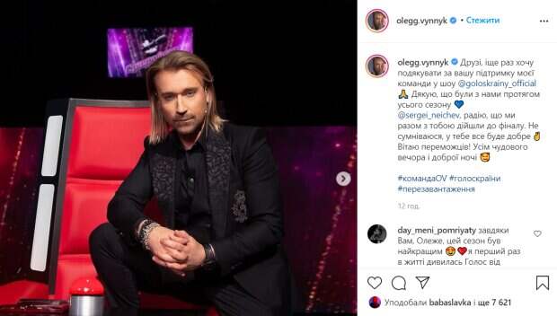В своем Instagram знаменитость часто делится с фолловерами яркими публикациями из своей насыщенной жизни. "Друзья, еще раз хочу поблагодарить за Вашу поддержку мою команду в шоу , Спасибо, что были с нами на протяжении всего сезона, поздравляю победителей! Всем замечательного вечера и доброй ночи", - написал Винник. Отдельно Винник выразил слова благодарности своему подопечному, с которым дошли до финала Сергею Нейчеву. Фолловеры не прошли мимо тренера и активно комменитируют: "Благодаря вам, Олег, этот сезон был лучшим, и я первый раз в жизни удивлялась Голосу от начала до конца". "Спасибо вам, Олег,за то,что украсили этот проект собой