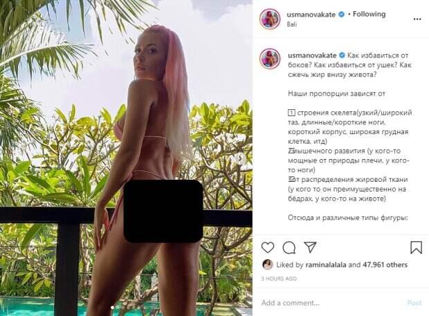 Так у кого-то от природы широкие бедра или мускулистые плечи, а у кого-то узкая грудь и пухлый живот. "Скелет не поменять. Но Отличная новость, что мы можем влиять на 2 и 3 пункт. Наращивать мышечную массу и сжигать лишний жир! Меняя пропорции в сторону песочных часов", - пишет тренер. - "Если есть жир только на боках/внизу живота, то сжечь его локально невозможно, только продолжая «худеть»". По словам Екатерины Усмановой, наращивая мышечную ткань, можно не сидеть на голодной диете и при этом получить идеальную внешность: "Чтобы не превратиться в скелета и не скатиться совсем на голодовку, нам и нужны мышцы!! Они позволяют есть и сжигать жир, потому что «перерабатывают» съеденные калории! И плюс добавляют телу округлости в нужных местах". Вдобавок, фитнес-тренер показала результат своих тренировок. На опубликованном фото девушка позирует в крохотном розовом купальнике, который только подчеркивает ее стройную фигуру. Усманова стала к камере полуоборотом, показав свои упругие бедра и соблазнительную пятую точку. Ранее Екатерина Усманова показала, как как выглядела 7 лет назад. Тренер выложила свое фото в синем купальнике со стразами, на которой выглядит очень загоревшей. Напомним, фитнес-тренер Усманова еле прикрыла пикантные места в бикини из веревочек. А еще Politeka писала, что фитнес-тренер Усманова спустила майку и показала то, что обычно прячет. Также Politeka сообщала, что обнаженная фитнес-тренер Усманова взбудоражила смелым кадром в постели с мужем.