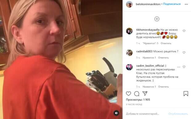 Голос за кадром, судя по всему, принадлежащий ее концертному коллеге Андрею Данилко, спросил, что она готовит. Белоконь ответила, что борщ, но гость продолжал снимать и допытываться у нее, а будет ли тот вкусным. Тогда мама Верки Сердючки с возмущением отмахнулась: "Андрей, пожалуйста, успокойся ради бога... ну что ты, как это... Андрей!" При этом в кадр попала пустая бутылка из-под алкоголя. Забавная сцена на кухне произвела фурор. Пользователи кинулись комментировать увиденное: "На це можно дивитись вічно