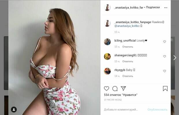 Так, звезда надела белое платье с красивыми розовыми цветами. Огромное декольте, из которого выставился бюст, притягивало взгляд. Модель приспустила тонкую бретельку наряда с плеч, прибавляя образу пикантности. Грудь Настя сжала руками, приподнимая его снизу. Модель сверкнула ножкой в разрезе распутного платьишка. Она распустила волнистые волосы и опустила глаза. За 15 часов пост в фан-группе собрал более 500 лайков и много комментариев. Пользователи сети написали в сторону жаркой красотки много комплиментов. "Леди совершенство", - написал один из поклонников. Ранее мы писали, что Анастасия Квитко прошлась по улице в соблазнительном топике, из которого едва ли не вываливалась огромная грудь. Модель шла недолго, радуя своими видами со всех ракурсов. Ее бюст притягивал взгляд, ведь кружевной топик казался ненадежным, как и его тончайшие бретельки. Казалось, бюст сейчас выпрыгнет, разрывая одежду. Напомним, Анастасия Квитко показалась в джинсах и кофточке с огромным декольте. Волосы у красотки были распущенными, а образ Анастасия дополнила стильной шляпкой и сумкой в руке. Пышный бюст прямо выпирал из наряда, ведь бельем он не был сжат в этот раз. "Привет, ребята, я хочу представить", - написала звезда под фото. Напомним, пышногрудая русская Кардашьян едва удержала свои «арбузики» за барной стойкой А еще Politeka писала, что русская Кардашьян смело вывалила свои "бомбочки" из белья с кружевом Также Politeka сообщала, что русская Кардашьян покрутила аппетитным «персиком» в крохотном купальнике