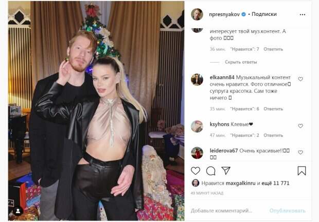 Певец и внук российской певицы Аллы Пугачевой, Никита Пресняков, похвастался красоткой-женой Артист признался, что решил слегка поднять популярность своей страницы в Инстаграм, передает Politeka.net. Музыкант надел черный пиджак и кофту такого же цвета, а также он был в серых джинсах. Никита стоял позади своей жены, модели Алены Красновой.