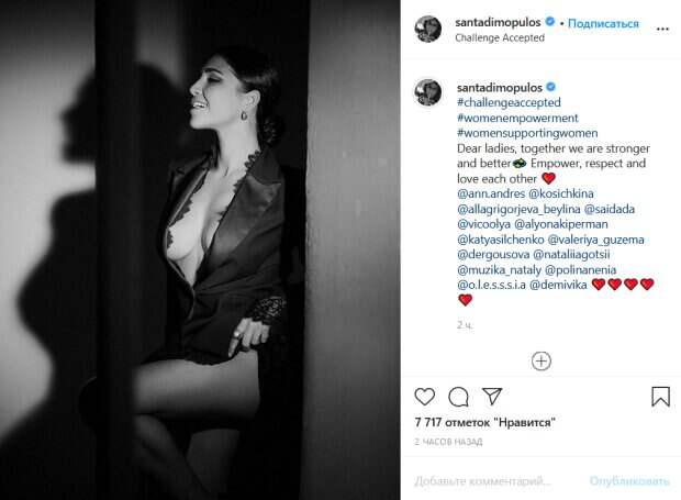 Участница нового сезона шоу «Танці з зірками» Санта Димопулос покорила откровенным образом в кокетливом наряде Известная украинская певица и экс-солистка группы ВИА Гра поделилась новым снимком в своем Инстаграм. Она приняла участие в новом челлендже в поддержку женщин. «Дорогие дамы, вместе мы сильнее и лучше.
