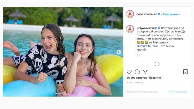 На новых фото 15-летняя Маша и 9-летняя Алиса Поляковы пытаются сфотографироваться в море, лежа на матрасе. Однако, сестры не могут не дурачиться друг с дружкой, поэтому кога младшая начинает выкручивать руку старшей, та попросту сталкивает ее в воду, а затем еще и «топит» сестренку. «Вот такая кара за испорченный снимок! Сёстры блин)))) пролистайте всю карусель, чтобы знать, чем закончилась фотосессия», - написала Полякова. Ее поклонники тут же принялись комментировать пост звезды. «Сами в недавно плакали что. Концертов нет, денег нет, а сами теперь людей дразните такими фотографиями с отдыха, некрасиво», «Сестринская любовь это навсегда», «Кто выжил?», «Классные у Вас дети, а старшая ваша супер копия, фигура мечта», «Красотулички жируют», «Малая прикольная», «Манька притопила конкурентку по фотосессии», «Алиса ещё тот чертёнок. Её выражение лица незабываемое», «Ох Алиса наверное была злая после такого ныряния. Маше хана», - пишут люди. Напомним, 15-летняя дочь Поляковой в купальнике показала, что унаследовала от знаменитой мамы: "Ого, ничего себе...". Как сообщала Politeka, 15-летняя дочь Поляковой в купальнике оконфузилась на камеру, мама не сдержала смеха: "Давай, детка. ..". Также Politeka писала, что именинница Полякова впервые решилась показать своего мужа на Мальдивах, редкие кадры.