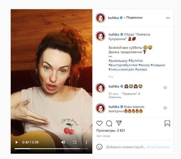 Девушка решила попеть коротенькие песни, развлекая фанатов. "Добрый вечер. С вами я, поэтесса, Виктория Какашкина, ой. Кукушкина. Песня: "Заливала водку в рот, водка в печень больно бьет. Но нас не погубит, если бьет, значит любит". Что? Ну, если не подходит корпоративно-актуальное, то пожалуйста, можно про лето: "Я водой их поливаю, на ночь пледом укрываю, поскорее выростите мои маленькие тити" Что? это про огород", - шутила виктория и спела еще несколько песенок. "Образ "Поэтесса Кукушкина" Весёлой вам субботы Делать продолжение?", - написала красотка под видео. "Всем жарких выходных", - добавила в комментарии Виктория. "Очуметь, круто", "Как жизненно", "Голос чудный", "Вика, ты огонь". Напомним, Булитко из "Дизель шоу" примерила свадебное платье и побывала за штурвалом самолета А еще Politeka писала, что блондинка из "Женского квартала" заставила Булитко из "Дизель шоу" попотеть Также Politeka сообщала, что Булитко из "Дизель шоу" удивила снимком в свадебном платье