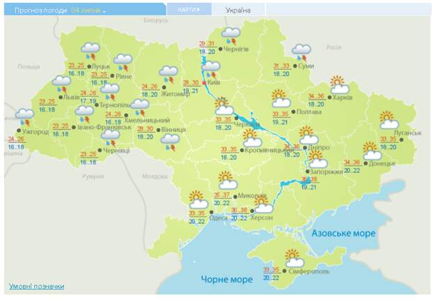 Столбики термометров днем покажут 33°-36°, ночью 18°-20°. Читайте: Жара и летние грозы на Западе — погода в неделю (КАРТА) На Востоке также будет достаточно солнечная погода, днем 33°-35°, ночью 18°-22°. Жителям южных областей стоит приготовиться к тому, что погода будет облачной с прояснениями. Температура воздуха днем прогреется до 38°, ночью до 22°. В целом погода в июле в Украине будет по-настоящему летней. В южных областях столбики термометров будут подниматься выше 30°. На Закарпатье и в западных областях также будет жарко — до +30°. А вот в последних числах июля всю Украину накроют сильные ливни.