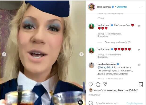 "Метр восемьдесят три. Извините, но это только на железной дороге работать. Ну красивые женщины – они же все невысокие", - сказал Дурнев. Леся Никитюк не стала молчать, записала юмористическое видео, где переоделась в проводницу, и передала привет своим "коллегам" – Маши Ефросининой и Оли Поляковой, которые также очень высокие (180 см обе). Также Никитюк прошлась и по Дурневу. "Опущусь на секунду до твоего уровня юмора и скажу так, чтобы тебе было понятно: ты со своим ростом видел только пилотку проводницы!",- резко сказала Леся. В комментариях телеведущую поддержали многие украинские звезды, в том числе и Маша Ефросинина, солистка группы "KAZKA" Александра Зарицкая и Валерия Товстолес из "Женского квартала". "Любовь любовь ❤️❤️❤️❤️", - написала Зарицкая. "Ах ты ж ёптить, так все еще хуже с человеком, дело в росте, оказывается!", - не сдержалась Ефросинина. "