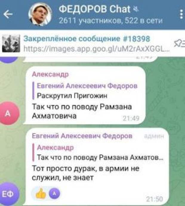 Депутат Государственной Думы Евгений Федоров в беседе с РБК прокомментировал информацию из ряда telegram-каналов об оскорблениях в адрес Рамзана Кадырова. Напомним, что по Сети распространился скрин, где от имени Федорова глава Чеченской республики называется «дураком, который не служил в армии». «Кто-то, судя по всему, из ЦПСО – мы называем это “из ЦРУ”, потому что они начальники – разместил сообщение, назвал себя моей фамилией и его сфотографировал», — оправдался депутат.