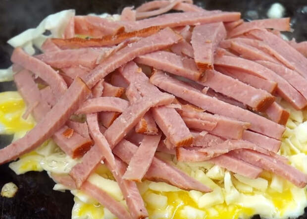 Вместо яичницы на завтрак можно приготовить сытный бутерброд с яйцом – популярное блюдо из Кореи. Мы просто натрем в яичницу колбасу и поджарим с тостовым хлебом. Первыми на сковороду, на небольшой огонь отправляются тосты. В отдельном стакане чуть перемешивается яйцо с сыром и тоже выливается на сковороду.