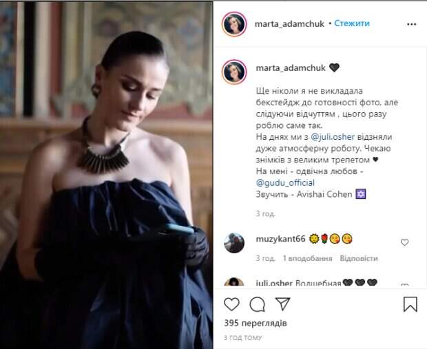 Так, на Марте объемное черное платье, присобранное сверху и снизу, а также перчатки до локтей. Девушка, будто налитый бутон цветка или воздушный шарик, "порхала" из одного пустующего зала в другой, улыбаясь в камеру, делая театральные движения и демонстрируя себя во всевозможных ракурсах. В глаза бросается пикантная деталь: на Марте нет нижнего белья. Необычный лук дополнили массивное ожерелье и серьги-цилиндры. "Еще никогда я не выкладывала бэкстейдж до готовности фото, но следуя ощущением, на этот раз делаю именно так. На днях мы отсняли очень атмосферную работу. Жду снимков с большим трепетом ♥", - поделилась мыслями певица. Пользователи кинулись комментировать увиденное, поставив за несколько часов сотни лайков: "Волшебная