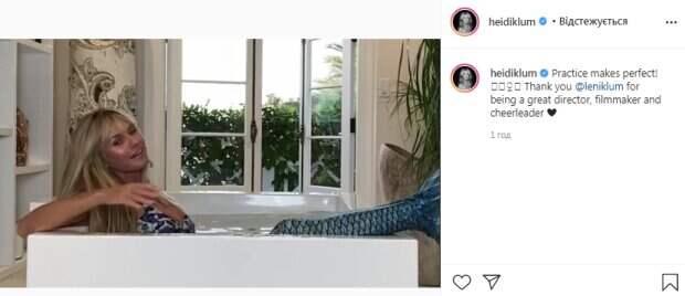 Стоит отметить, что Клум поделилась довольно забавным видео. Она показала закулисье съемки, которая проходила не очень просто. Красотке далеко не с первого раза далось плавание под водой с хвостом. Ей пришлось повторять несколько дублей, чтобы получилось проплыть красиво. Она ныряла под воду и не могла справиться с управлением, вспылвая наружу. «Практика ведет к совершенству! Спасибо leniklum за то, что ты отличный режиссер, режиссер и чирлидер», - подписала видео звезда. Судя по подписи к видео, Хайди снимала ее старшая дочка Хелен Клум. Наверняка и молодой муж звезды участвовал в этой съемке. Как известно, в прошлом году 47-летняя Хайди вышла замуж за 30-летнего музыканта Тома Каулица. На совместных фото Хайди и ее молодой муж выглядят счастливыми. Недавно они отметили первую годовщину совместной жизни. Напомним, что Хайди Клум слетела с катушек и слила в сеть интимные утехи с молодым мужем: «Слишком горячо». А еще Politeka сообщала, что горячая Хайди Клум разделась и показала, как соблазняет молодого мужа: с такой не заскучаешь. Также Politeka писала, что роскошную Хайди Клум засняли в кустах в одном белье, видно все: повезло молодому мужу.