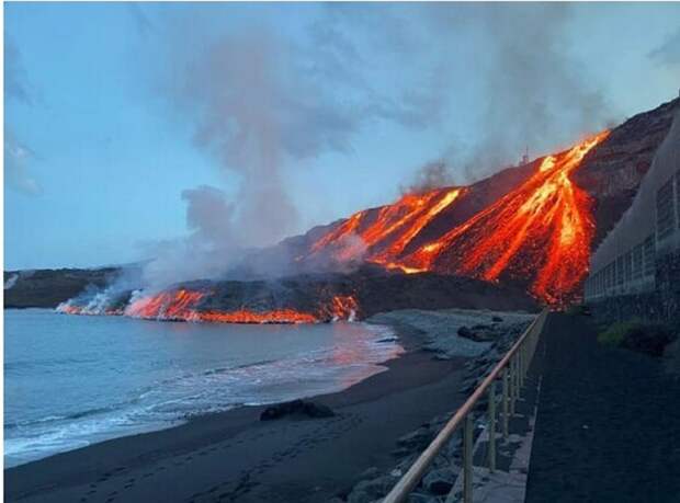 Более семи лет на Канарских островах извергается вулкан. Еще один поток лавы уже достиг Атлантического океана. Кадры с острова ла-Пальма показывает RTVE. Расплавленная порода, температура которой составляет около 800-900 градусов по Цельсию, разлилась раскаленными каскадами на пляж в Гирресе. Местные власти предупредили, что после столкновения лавы с водой образовывается водяной пар с частицами соляной кислоты, которые могут быть опасны для здоровья человека.