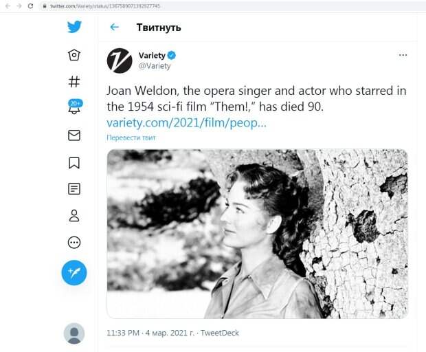 «Талантливая и успешная оперная певица и актриса театра, кино, мюзиклов и телевидения, она была известна многим как Джоани, чья любовь к беззаботным шуткам и розыгрышам приносила радость, куда бы она ни пошла». Джоан Луиз Уэлтон (настоящее имя) родилась в 1930 году в Сан-Франциско в преуспевающей семье. Мать умерла, когда ей было пять - воспитанием занималась бабушка. С детства училась музыке, подростком - вокалу. Пела в хоре Оперного театра Сан-Франциско. Тогда же была замечена продюсером Стэнли Рубином, организовавшим для девушки кинопробы. Джоан дебютировала в кино в 1953 году, выпустив криминальную драму «Система». Джоан работала с Warner Bros. до 1954 года и играла роли в таких фильмах, как вестерны «Мальчик из Оклахомы» с Уиллом Роджерсом-младшим и «Верховая езда из дробовика» с Рэндольфом Скоттом. Там актриса получила известность благодаря культовому научно-фантастическому фильму «Они!», Черно-белому фильму о монстрах о гигантских муравьях. В фильме она сыграла доктора Пэта Медфорда вместе с Джеймсом Уитмором и Эдмундом Гвенном. Joan Weldon, the actress pursued by giant ants in Them! (1954), dies at 90, on Feb 11, 2021. In Them!, her Dr. Pat Medford & her father are mycologists sent to investigate after weird tracks discovered in the NM desert, created by ants mutated by an A-bomb. Life was simple then. pic.twitter.com/rEw42NAtyT — Loren Coleman (@CryptoLoren) March 5, 2021 Помимо съемок в фильмах и телешоу, таких как Perry Mason и Maverick, Джоан была также оперной певицей и театральной актрисой. «Яркая и элегантная женщина, ее будет очень не хватать всем, кто знал эту замечательную и неординарную женщину», добавила семья. У Джоан остались муж доктор Дэвид Л. Поделл-младший, дочь Мелисса, падчерица Клаудия и внуки Сиенна, Александр и Элла. Напомним, остановилось сердце гениальной актрисы, болезнь оказалась сильнее: "За несколько дней до дня рождения" Как сообщала Politeka, жизнь популярной певицы трагически оборвалась из-за несчастного случая: «хотела посмотреть на…» Также Politeka писала, что ушла из жизни легендарная актриса, ее красотой и талантом восхищались миллионы: "Была поистине королевой кино"