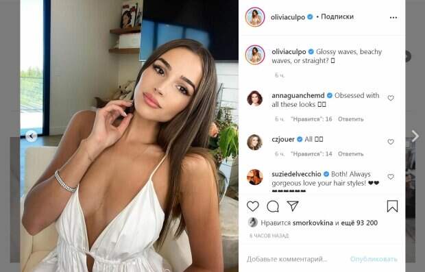 Это был сарафанчик, держащийся на тончайших бретельках, которые, казалось, вот-вот соскользнут с плечей. Огромное декольте было настолько смелым, что привлекало внимание, а акценту к нему еще и прибавляли красивое украшение. Грудь запряталась под тканью, едва не выставившись во всей красе. Звезда распустила длинные ровные волосы, которые красиво опустились по спине. Модель почти черными глазами смотрела в камеру и слегка улыбалась. За несколько часов пост собрал более 90 тысяч лайков и много комментариев. Пользователи сети восхищались идеальной внешностью красотки и писали в ее сторону массу восторженных слов. "Богиня", - написал один из поклонников. Ранее мы писали, что Оливия Калпо сняла себя в зеркало, расстегнув блестящий пиджак, под которым ничего не оказалось. Звезда скрыла за тканью свой пышный бюст, но при этом под ней проглядывалось самое интимное. Звезда также надела облегающие шортики, которые замечательно подчеркнули ее бедра и обтянули ягодицы. Ранее сообщалось, что Оливия Калпо позировала в желтой рубашке, которую кокетливо распахнула. Под одеждой не оказалось белья, что было видно невооруженным взглядом. При этом в декольте можно было заметить длинную золотую цепочку, которая также соблазнительно подчеркивала груди. Напомним, что "Мисс Вселенная" Оливия Калпо распахнула сверкающий пиджачок, под которым ничего не оказалось: "Шик!" А еще Politeka писала, что "Мисс Вселенная" Оливия Калпо кокетливо приспустила с плеч белоснежный халатик: "Улетные формы" Также Politeka сообщала, что Оливия Калпо в крохотном купальнике устроила игрища: «Непревзойденная».