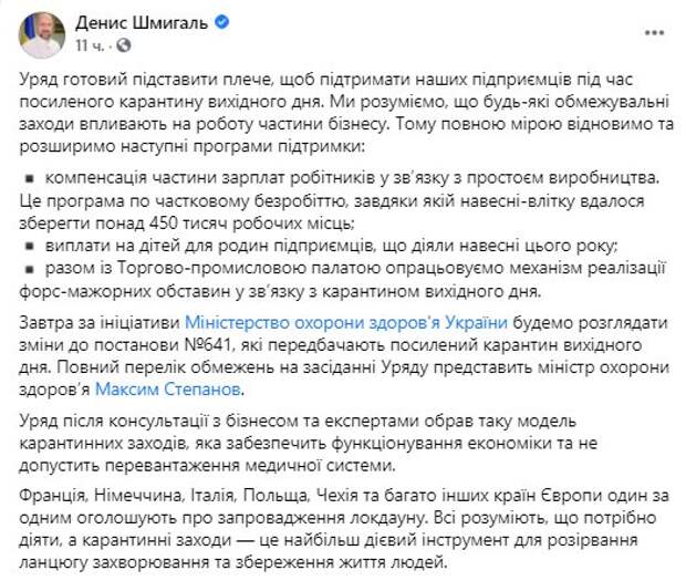 Это программа по частичной безработице, благодаря которой весной-летом удалось сохранить более 450 000 рабочих мест; ▪️ выплаты на детей для семей предпринимателей, действовавших весной этого года; ▪️ вместе с Торгово-промышленной палатой прорабатываем механизм реализации форс-мажорных обстоятельств в связи с карантином выходного дня. Украинцы в штыки восприняли заявление главы Кабмина. В комментариях пользователи обеспокоены тем, что такая "забота" в итоге вылезет предпринимателям и простым гражданам боком. "а как быть ФОПам без наемных работников, к примеру занятых в турбизнесе, которые уже почти "умерли", доходов минус ноль, аренду нечем платить, не за что жить и содержать семьи, им что делать, может, посоветуете???" "Конечно будете подставлять плечо как всегда крупному бизнесу, а маленьким подарите карантин выходного дня и каждому маленькому предпринимателю тяжелый кассовый аппарат на шею повесите (((" "Господин премьер, "забота" об украинцах, предпринимателей в частности, ВСЕГДА выходит нам боком. Лучше бы вы не беспокоились и не подставляли плечо в ручном режиме, а суды с налоговой реформировали. Тогда у людей появились деньги и без заботы государства" "Это ложь, никаких компенсации мы не получили сказали - нет бюджета. Зато налоги платили, при чем из собственного кармана, так как доходов нет" "Пару тысяч в месяц, если еще повезет, не спасут ни один бизнес!" "просто издеваетесь" "Вам не стыдно так лгать?" "450 тысяч рабочих мест??? Вы шутите??? Вы в курсе, что только в отрасли общепита задействовано более 5 млн человек!!!" Напомним, предположительно, карантин выходного дня начнет действовать с 14 ноября, хотя точной даты еще не назвали. Ограничения будут вводиться с 00:00 субботы до 00:00 понедельника на всей территории Украины (независимо от цвета карантинной зоны). Напомним, карантин по-новому с 9 ноября: в Кабмине объявили о важных изменениях и где остановится транспорт Ранее Politeka писала, что карантин максимально ужесточат, появилось важное заявление Степанова: "Будет общая зона..." Также Politeka сообщала, что карантин выходного дня вводят в Украине, что будет с транспортом и магазинами