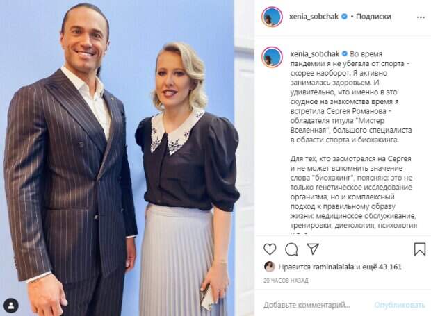Как стало известно из поста звезды, Романов займется самым ценным – ее здоровьем. Вместе со спортсменом они разработают график питания, тренировок и обследований. «Во время пандемии я не убегала от спорта — скорее наоборот. Я активно занималась и работала над своей физической формой. И удивительно, что именно в это скудное на знакомства время я встретила Сергея Романова», - рассказала Собчак. По словам телеведущей, красавчик-спортсмен испробует на ней различные программы по улучшению здоровья. Судя по всему, муж звезды, режиссер Константин Богомолов остался не у дел, ведь не присоединиться к жене в ее занятиях по улучшению тела. Вместо него с ней будет работать один из красивейших мужчин мира. Отметим, что Сергей Романов известен не только как спортсмен и обладатель титула, он также занимается бизнесом, снимается в кино и выступает на различных чемпионатах. Напомним, что с Собчак случилась беда, ее срочно прооперировали: что произошло, первые подробности. Как сообщала Politeka, Богомолов без ума даже от пьяной Собчак, интимные кадры: "А за рулем Ефремов?". Также Politeka писала, что Собчак с переломанным носом настигла новая беда, в сети появились кадры: "Здоровенные бугаи толкнули так. ..".