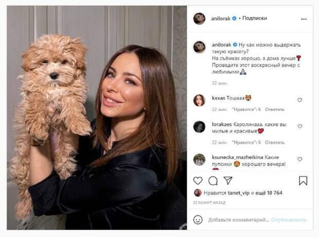 Об этом пишет Politeka.net со ссылкой на страничку знаменитости. "Ну как можно выдержать такую красоту? На съёмках хорошо, а дома лучше. Проведите этот воскресный вечер с любимыми", - написала звезда под фото. Фанаты поставили почти 20 тысяч лайков и написали комментарии: "Каролина, какие вы милые и красивые", "Какие пупсики, хорошего вечера!", "Какие вы булочки", "Какой мальчик, что за порода?", "хорошего вечера, Каролина!", "Безумно красивые, не могу насмотрется!", "Каролина, какое милое фото. Очень нравится ваш четвероногий друг!". Сообщалось, что певица Ани Лорак заинтриговала публику свежими кадрами, показав, как приехала на съемки. "Всем доброе утро, хорошего дня! Еду на съемку сегодня, будет замечательный новый проект... Так что посмотрите потом, как получилось", - заявила артистка, засняв себя в машине по дороге на работу. Напомним, счастливая Ани Лорак в кожаной юбке и с букетом роз засветилась на прогулке Также Politeka писала, что Ани Лорак нараспашку посветила фигурой в дерзкой позе, заинтриговав сюрпризом А еще Politeka сообщала, что 42-летняя Ани Лорак в легкомысленном наряде заставила говорить о себе