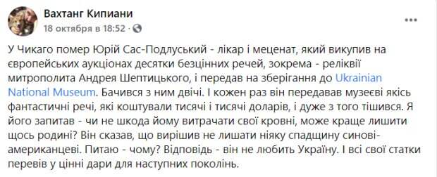 В частности, речь идет о реликвиях митрополита Андрея Шептицкого. Их он передал на хранение в Ukrainian National Museum. "В Чикаго скончался Юрий Сас-Подлуский - врач и меценат, который выкупил на европейских аукционах десятки бесценных вещей, в частности - реликвии митрополита Андрея Шептицкого, и передал на хранение в музей", - написал Кипиани. Соболезнования по поводу смерти врача-мецената выразила и куратор Украинского музея в Чикаго Мария Климчак. На своей странице в Facebook она отметила, что потеряла друга, с которым они дружили 20 лет. "В калейдоскопе чикагских событий его жизни – врачебная практика – оказывал помощь всем, лечил и преподавал, держа руку на пульсе истории: коллекционировал, изучал, записывал, чтобы все передать музею, как часть сохраненной им истории и культуры Украины. О таких, как он, говорят – подаренные Богом, потому что рождаются один раз в столетие! Покойся с миром, дорогой господин Юрий! Мы всегда будем Вас помнить. Вечная память!" – подчеркнула Климчак. Доктор Юрий Сас-Подлуский первым в 60-х годах прошлого века для американского журнала "The Medal Collector" написал о важнейших событиях эпохи освободительной борьбы за независимость. Благодаря ему в журнале был основан раздел "Награды Украины". За меценатскую деятельность Сас-Подлуский награжден грамотой от Блаженнейшего Святослава, главы Украинской Греко-Католической Церкви. Напомним, ветеран АТО решился на роковой шаг в День защитника Украины, детали трагедии. Как сообщала Politeka, китайский вирус унес жизнь легендарного харьковского артиста. Также Politeka писала, что в Харькове оборвалась жизнь знаменитого врача и ученого.
