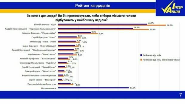 В опросе приняли участие 1500 респондентов. Полный рейтинг кандидатов в мэры Киева выглядят следующим образом: Виталий Кличко (УДАР) – 26,7% Андрей Пальчевский (Перемога Пальчевського) – 22,4% Николай Томенко (Рідна країна) – 9,8% Сергей Притула (Голос) – 5,6% Александр Попов (ОПЗЖ) – 5,3% Ирина Верещук (Слуга народа) – 5,1% Андрей Билецкий (Національний корпус) – 4,7% Игорь Смешко (Сила і честь) – 4,6% Алексей Кучеренко (Батьківщина) – 2,9% Александр Омельченко (Єдність) – 2,5% Сергей Гусовский (За майбутнє) – 2,1% Дмитрий Гордон (Сила і честь) – 1,8% Борислав Береза – 1,5% Сергей Шахов (Наш край) – 1,2% Стоит отметить, что согласно данным соцопроса, 38,9% респондентов негативно оценили работу действующего мэра Виталия Кличко. Это отразилось и на его рейтинге: с начала месяца Кличко потерял 1,6%. Политический консультант Николай Спиридонов указал на наличие множества причин падения рейтинга Кличко. Одной из них он назвал постоянную хаотичную застройку Киева, а также серьезные проблемы с общественным транспортом. Эксперт подчеркнул, что главным конкурентом действующего мэра на выборах станет именно Пальчевский, с которым они встретятся во втором туре. «Наступает на пятки ему Андрей Пальчевский, представитель партии "Перемога Пальчевського"», - подчеркнул Спиридонов. Также киевляне определились с политическими партиями, за которые готовы отдать голоса на предстоящих выборах: Напомним, в Киеве массово закрывают школы и детсады, заявление Кличко. Как сообщала Politeka, Кличко нарядил коммунальщиков "от кутюр" и нарвался на гнев киевлян. Также Politeka писала, что Кличко припугнул киевлян "инфекционным взрывом".
