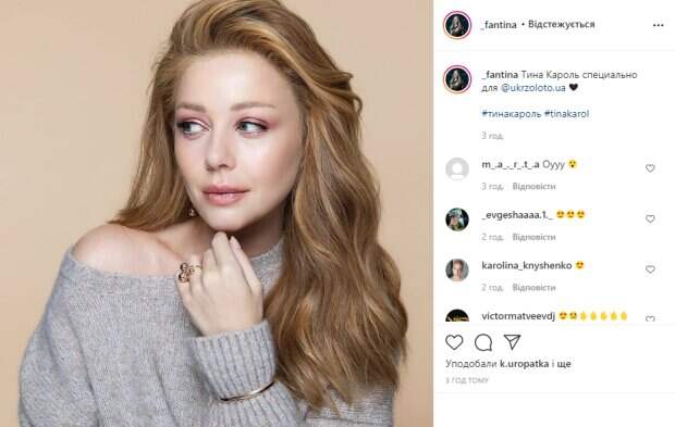 На новом снимке, который был снят в рамках рекламной фотосессии украинского ювелирного бренда, Тина позирует в очаровательном образе, и выглядит очень естественно. Перед камерой она появилась в теплом сером свитере, который предательски сполз с одного плеча, оголив его и изящную шею. Ее волосы распущены и мягкими прядями спадают на спину, а на лице легкий перламутровый макияж, певица загадочно смотрит куда-то в сторону. На руке Кароль помимо необычного колечка также видно милый золотистый браслет, который она надела поверх рукава свитера. В подписи к фотографии говорится: "Тина Кароль специально для @ukrzoloto.ua ❤ #тинакароль #tinakarol". Поклонники звезды в восторге от ее нового очаровательного фото, красотку засыпают комплиментами в комментариях к публикации. "Oyyy", "Воплощение женственности и красоты", "Идеал для мужчин", "Безумно красива и прекрасная", "Супер", "Красотка", "Очаровательная", - пишут пользователи под снимком Кароль. Как известно, певице уже давно приписывают роман с молдавским музыкантом Даном Баланом. Все началось с прямых эфиров "Голоса страны", потом Тина и Дан записали чувственную песню дуэтом, а в интервью не опровергали, а иногда даже подливали масла в огонь слухов о своем романе. Поклонники в восторге от творческого союза артистов, многие подталкивают Тину вступить в романтические отношения с Баланом. Напомним, "Полякова молодец! Умеет повлиять": страстная Кароль задрала ноги к потолку, хвастаясь растяжкой. Как сообщала Politeka, Кароль раскрыла секрет о беременности и Дане Балане: «Какое-то чудо, а не ...». Также Politeka писала, Кароль после своего скандала поразила словами о единственном мужчине: "А пока...".