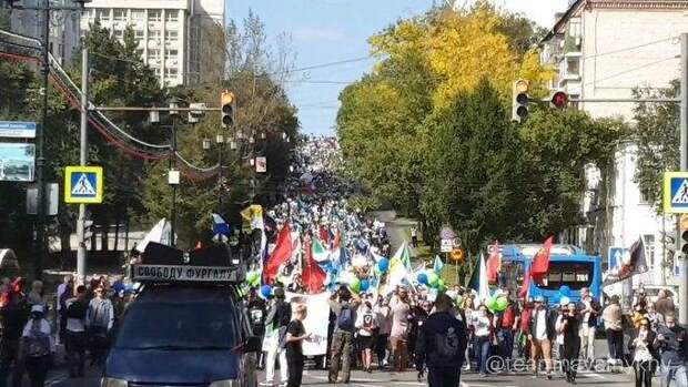 Флаги белорусских националистов были вновь замечены на очередном митинге в поддержку арестованного бывшего губернатора Хабаровского края Сергея Фургала (это был уже 78 день протестов). На видео, появившихся в сети, видно что в толпе (10 тысяч человек, по мнению оппозиции, 500 – по подсчетам мэрии) практически нет государственных флагов РФ.
