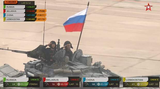 За лидерство в финальном заезде боролись танковые экипажи России, Белоруссии Китая и Узбекистана. Танкисты из Узбекистана и России выступали на российских танках Т-72Б3, зеленом и желтом соответственно. Китайский экипаж выступал на синей машине производства КНР Type 96, а белорусские танкисты — на красном Т-72, на котором белорусскими специалистами произведен ряд доработок. Напомним, 27 августа VIII Армейские международные игры подойдут к концу. На торжественной церемонии закрытия игр в парке «Патриот» с участием представителей команд и руководства военных ведомств стран-участниц Игр команде-победительнице будет вручен Кубок Армейских международных игр.