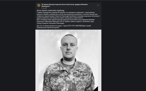 Смелым морским пехотинцем и искренним патриотом своей страны он навеки останутся в нашей памяти", - говорится в сообщении. Побратимы Александра выразили свои соболезнования в связи с тяжелой утратой "Весь личный состав отдельной бригады морской пехоты имени контр-адмирала Михаила Белинского Военно-Морских Сил ВС Украины глубоко скорбят и выражает искренние соболезнования родным и близким Александра", - сказано в сообщении. Украинцы также выразили искренние соболезнования и поблагодарили бойца за службу. "Царство Небесное Герою", "Вечная память ... Пусть Господь Бог упокоит душу воина где покоятся праведные", "Царство Небесное света и вечная", "Светлая память тебе, сын Украины", "Искренние соболезнования. Спасибо за службу!", - писали в комментариях под постом. Напомним, ВСУ показали боевую мощь страны на учениях с НАТО, появилось впечатляющее видео. Как сообщала Politeka, украинские защитники поженились прямо на передовой, трогательные фото. Также Politeka писала, что отряд полицейских вернулся после боев на Донбассе, трогательные кадры.