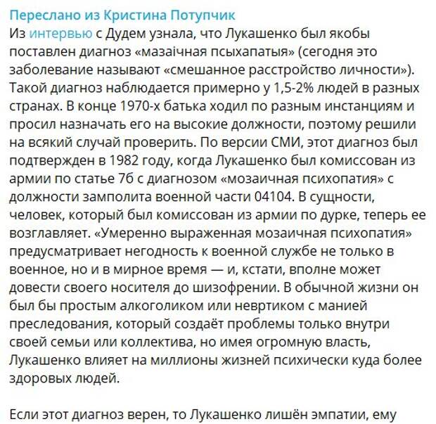 В интервью обговаривались общественно-политические темы. Затронули в нем и личности Александра Лукашенко, отметив, что еще 28 лет назад ему поставили диагноз "мозичная психопатия". Сейчас этот диагноз называют "смешанное расстройство личности". Блогер отметила, что изучила эту тему более детально и узнала, что в конце 1970-х Лукашенко ходил по разным инстанциям и просил назначать его на высокие должности, поэтому решили на всякий случай проверить его психику. Раньше такие медицинские проверки проходили постоянно. По версии СМИ, этот диагноз был подтвержден в 1982 году, когда Лукашенко был комиссован из армии по статье 7б с диагнозом "мозаичная психопатия" с должности замполита военной части 04104. "В сущности, человек, который был комиссован из армии по дурке, теперь ее возглавляет. Умеренно выраженная мозаичная психопатия предусматривает негодность к военной службе не только в военное, но и в мирное время — и, кстати, вполне может довести своего носителя до шизофрении", - рассказала Кристина Потупчик. Она пояснила, что в обычной жизни человек с таким диагнозом был бы простым алкоголиком или невротиком с манией преследования, который создаёт проблемы только внутри своей семьи или коллектива, но имея огромную власть, а Лукашенко влияет на миллионы жизней психически куда более здоровых людей. Блогер добавила, что если этот диагноз верен, то Лукашенко лишён эмпатии, ему трудно устанавливать длительные отношения, он все объясняет через теорию заговора. "Когда Лукашенко говорит, что его придётся убить, чтобы забрать власть, он, похоже, не шутит. Человек с диагнозом психопатия не должен брать в руки оружие, потому что он рано или поздно превращается в полковника Курца. Сегодня он загнан в угол, поэтому хватается за оружие и заставляет своего сына носить бронежилет. То есть, он реально готов сражаться за Беларусь до последнего белоруса", - резюмировала блогер и добавила, что надо всех кандидатов в президенты проверять в психиатра. Напомним, Зеленский поведал Александру Лукашенко, что его ждет в ближайшем будущем: "Я однозначно поддерживаю...". Как сообщала Politeka, Лукашенко пошел на сделку с Путиным: "мы договорились о том, что Россия...". Также Politeka писала о встреча Лукашенко и Путина: раскрыты детали сделки, "поддержка Кремля в обмен на...".