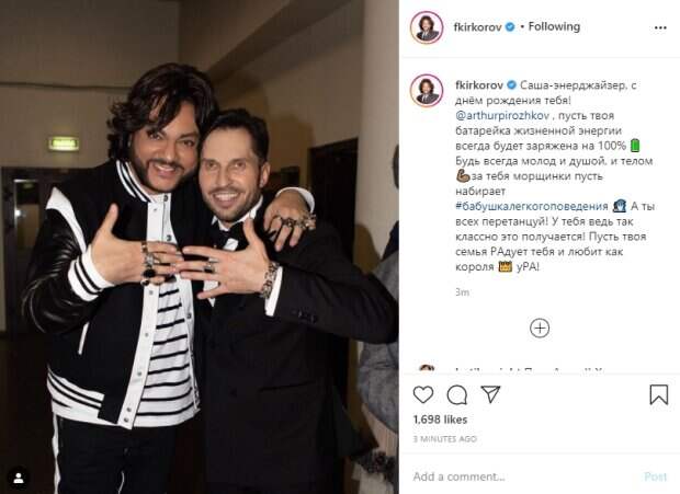 На снимке Филипп Киркоров позирует в черно-белом образе, который состоит из спортивной куртки, полосатой футболки с спортивных штанов. Исполнитель обнимает за плечи Александра, наряженного в черный смокинг с "бабочкой". Обе звезды улыбаются и касаются руками, увешанными перстнями. "Саша-энерджайзер, с днём рождения тебя! @arthurpirozhkov, пусть твоя батарейка жизненной энергии всегда будет заряжена на 100%