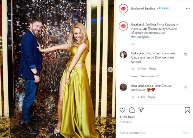 Исполнительница запечатлена на фоне декораций проекта "Танці з зірками" в желтом платье с откровенным депольте и длинным разрезом на бедре. Она шаловливо изогнулась и уперлась рукой в грудь актера, который воспринял такие заигрывания с лукавой улыбкой. Сам Александр позирует в синем пиджаке с чуть подкатанными рукавами, джинсах и в коричневых ботинках, а отросшая борода придала ему мужественности. Пользователи соцсети в комментариях высказались о шалостях звезд, некоторые вспомнили о певце Дане Балане, с которым у Тины тоже были весьма неоднозначные отношения: "Я так понимаю, Саша платье от Dior так и не купил?"; "Самые любимые"; "платье - отпад!