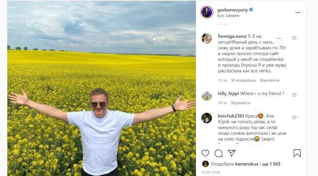 Несмотря на занятость, телеведущие стараются много путешествовать. На свежих фото Горбунов показал, как карсиво выглядит поле с цветущим рапсом - необъятные территории солнечно желтого цвета на горизонте встречаются с голубым небом. Горбунов стал среди цветещего рапса, раскинул руки и позирует на камеру. Телеведущий в обычной белой футболке и удобных спортивных штанах. На его лице защитные солнечные очки. "Вот они - ланы широкополые! Днепровские утесы - в другой стороне", - подписал снимок артист, вспомнив стих Тараса Шевченка "Заповіт". В комментариях ему оставили массу восторженных слов. Поклонников умилило фото. "Краса