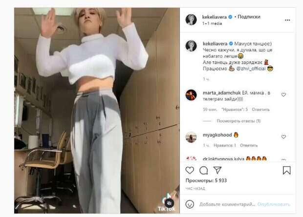 Год назад актриса родила первенца, но уже успела вернуться к творчеству. В этот раз Вера показала видео, где позировала в толпе и штанах. Кекелия начала танцевать в гримерке, демонстрируя эффектное владение телом. "Мамочка танцует;) Честно говоря, я думала, что это гораздо легче Но танец очень заряжает", - написала звезда под фото. Фанаты сразу принялись комментировать видео: "Эй, мамка, в телеграм зайди", "Крутая", "Крутая мамочка". Мы писали, что известная актриса Вера Кекелия поделилась новыми кадрами из преображением. "Моя племянница сказала, что эти кадры настоящая эстетика. А она знает толк - нынешняя молодёжь меня так удивляет своим мироощущением. Они точно знают как это быть собой, как это слышать свой внутренний голос, они знают, что такое свобода! В тот день мы тоже прислушались с Мартусей к своему мироощущению, позволили быть свободе и создали эту прекрасную эстетику;))", - написала Кекелия под фото. Напомним, лучезарная Кекелия из "Женского квартала" потрясла бюстом и ягодицами, разогреваясь в гримерке Также Politeka писала, что уверенная блондинка из "Квартал 95" избавилась от лифчика и подразнила томными позами А еще Politeka сообщала, что блондинка из "Женского квартала" на каблуках впечатлила растяжкой, задрав ногу выше головы