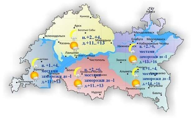 Сегодня в Татарстане ожидается облачная погода с прояснениями. Местами небольшой дождь. Об этом предупреждает Гидрометцентр республики. Днем температура воздуха в Казани составит +11..+13 градусов, в Набережных Челнах +13..+16 градусов, в Альметьевске +14..+16 градусов, в Нурлате +11..+13 градусов, в Буинске +11.