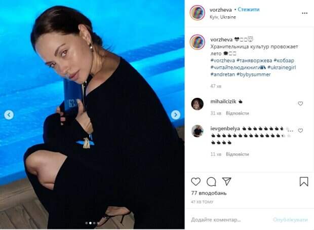 На фото Воржева позрует в черном комбинезоне и босоножках на шпильке. В руках она держит «Кобзарь». Ранее мы писали, что Татьяна Воржева поделилась ярким фото с отдыха на море. Певица позировала по грудь в воде, демонстрируя роскошную красоту на фоне воды. Кадр получился завораживающим, ведь кроме артистки и воды на фото больше ничего не было. «Возвращение к балансу», - подписала фото украинская Джоли. Напомним, что после участия в «Фабрике звезд» Воржева некоторое время пела в группе «REAL O», продюсированием которой занималась Наталья Могилевская. Девушку часто сравнивают с американской актрисой Анджелиной Джоли. При этом сама Воржева считает, что сходство у них не только внешнее. Напомним, украинская Джоли раскинула ноги и сделала сокровенное признание: "Будет приятно". Как сообщала Politeka, украинская Джоли взбудоражила пикантными занятиями в парке, кадры: в такую легко влюбиться. Также Politeka писала, что украинская Джоли покорила изгибами, забравшись на стог сена в лифчике: "Я расскажу тебе тайну..."