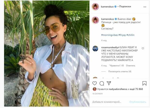 Об этом пишет Politeka.net со ссылкой на странички знаменитостей. На втором фото уже была Вера Брежнева. Звезда оставила волосы распущенными, а закрыла глаза черными очками. Певица сидела в авто, а образ дополнила теплым свитером. Закрывает тройку Анастасия Волочкова. Звезда позировала в легком платье и тапочках, а образ дополнила большими черными очками. Как можно заметить, балерина находилась на отдыхе в Турции, где проводила отпуск. На четвертом кадре уже Альбина Джанабаева. Звезда сидела в пиджаке и майке. Как можно заметить, девушка находилась на пляже, удобно устроившись на шезлонге. Певица оставила волосы распущенными, а образ дополнила стильными очками. Закрывает пятерку Анфиса Чехова. Звезда сейчас отдыхает на Мальдивах, поэтому показала себя в черном купальнике. Красотка лежала на гамаке, а рядом можно увидеть большую шляпку. Телеведущая дополнила образ стильными черными очками в белой оправе. Напомним, Каменских неожиданно преобразилась в молодую и горячую Анджелину Джоли А еще Politeka писала, что прилизанная Каменских сверкнула "богатством" в прозрачном декольте Также Politeka сообщала, что Каменских в полупрозрачном костюме показала «хищное» настроение, Плакидюк оценила