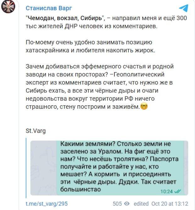 Вот и сейчас между пропагандистами ОРДЛО и россиянами в соцсети начался новый этап выяснения отношений, передает Диалог. Один из пользователей сети посоветовал жителям ОРДЛО собирать чемоданы и езжать на Урал, ведь никто не будет присоединять эти территории к России. "Столько земли не заселено за Уралом. На фиг еще это нам? Паспорта получайте и работайте у нас, кто мешает? А кормить и присоединять эти черные дыры. Дудки. Так считает большинство", - пишет пользователь российского сегмента инсайдеру Станиславу Варгу. Более того Варг настаивает на открытии консульства РФ на территории "Л/ДНР" для оказания правовой помощи всем желающим обладателям паспортов России. Другой пользователь сети возмутился такому ответу. Он искренне считает, что его собеседник неправ и должен продолжать спонсировать ОРДЛО. Военкор News Front Катя Катина тоже обиделась на позицию россиян и назвала их "филистером с сытым брюхом, ипотекой и невыплаченными алиментами, диванными инфоборцами, хатаскрайниками". "Русский народ помнит о том, что все русские земли нужно собирать и возвращать под крыло матушки-России. И час этот обязательно придет", - уверена пропагандистка. Напомним, боевики по пьяни несут колоссальные потери на Донбассе, главари потеряли контроль. Как сообщала Politeka, боевики передумали отдавать жизни за «независимый» Донбасс. Также Politeka писала, что боевиков "ДНР" косит новая напасть, жители не выдержали.
