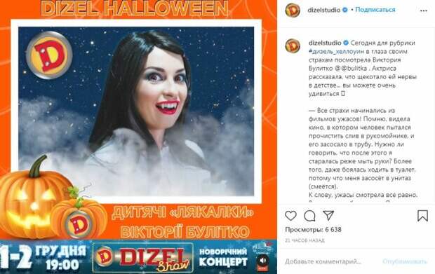 Участница шоу «Танці з зірками», актриса телевизионной программы «Дизель Шоу» Виктория Булитко появилась в неожиданном образе 31 октября люди отмечают международный праздник Хэллоуин, в честь чего актриса «Дизель Шоу» выбрала интересный образ, передает Politeka.net. Фото с Булитко появилось на официальной странице проекта в Инстаграм.