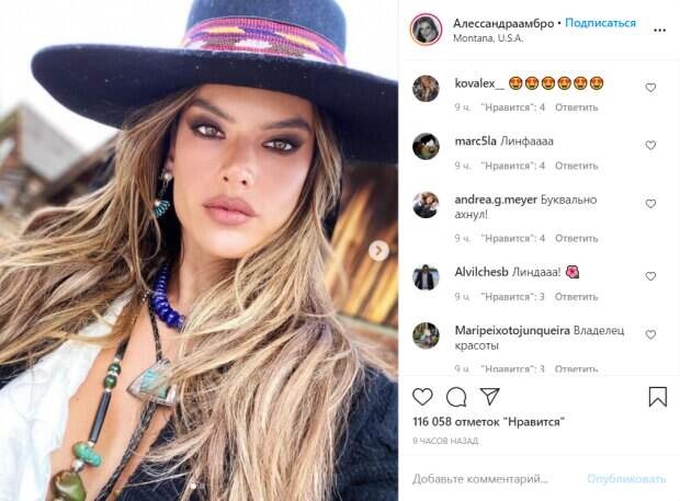 Алессандра решила выйти на пляж и использовать в своем образе вечную классику – белую рубашку, которая актуальна в любом сезоне. Поверх рубашки она накинула черный кардиган, который сделал образ супермодели соблазнительным и стильным. Об аксессуарах 39-летняя красавица также не забыла: на шее у нее красуется массивное колье, а в ушах – крупные серьги. Изюминкой образа стала мексиканская шляпка с яркими узорами в стиле бохо. Модель решила сделать акцент в макияже на глаза, соединив сразу несколько трендов, которые помогли сделать взгляд более выразительным. А на губы нанесла нюдовую помаду. Поклонники оценили эффектный лук звезды, об этом они сообщили в комментариях. "Владелица красоты", "Буквально ахнул!", "Замечательная она!", "Богиня", "Великолепно ❤️", "Богиня