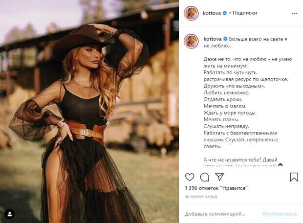 Из украшений на звезде браслеты на руках и массивные серьги. Однако, несмотря на легкомысленный вид, рассказала Котова о серьезных вещах, а именно о том, чего она больше всего в жизни не любит. Заодно исполнительница поинтересовалась, что не любят ее многочисленные поклонники. "Больше всего на свете я не люблю... Даже не то, что не люблю - не умею жить на минимум: Работать по чуть-чуть, растрачивая ресурс по щепоточке. Дружить «по выходным». Любить немножко. Отдавать крохи. Мечтать о малом. Ждать у моря погоды. Менять планы. Слушать неправду. Работать с безответственными людьми. Слушать непрошеные советы. А что не нравится тебе? Давай изгоним это из наших жизней