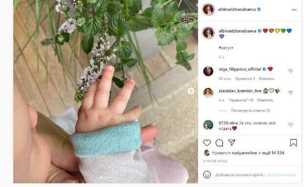 На фото можно увидеть ручки девочки и только частично лицо. Малышка рассматривала цветение растения. Фанаты, включая Надю Мейхер, поставили более 14 тысяч лайков и написали комментарии: "За это можно все отдать", "Ну какие же сладкие ручки !!!!", "Солнышко такое", "Маленькое солнышко", "Лапушка. Счастья и мира вашему дому", "Ути тоже, моя какая прелесть", "Молодцы ! желаю Вам только счастья, здоровья, любви, оставайтесь такими счастливыми и любящими родителями!Пусть всп у Вас исполниться и осуществиться", "Боже, как же она прекрасна". Напомним, жена Меладзе экс-ВИА Гра Джанабаева поразила поведением у дымящей машины, видео Также Politeka писала, что экс-ВИА Гра Джанабаева после родов показала, как развлекается с Меладзе А еще Politeka сообщала, что Экс-ВИА Гра Джанабаева похвасталась, как проводит время наедине с Меладзе