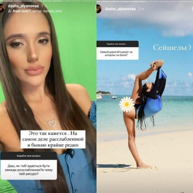 Девушка не стала плакаться на публику, но объяснила, что работает над собой и сейчас ей лучше. Также Даша решила поотвечать на вопросы аудитории в Инстаграм и сопроводить ответы весьма смелыми кадрами, не обошлось без фирменных шпагатов. Даша рассказала, что самый дорогой отдых, на котором ей доводилось побывать – это Сейшелы. А свой блог она ведет в лайфстайл стиле. «Почему сторисы однотипные: реклама, спортзал и самолюбование?» - спрашивает поклонник. Даша подметила, что другого не показывает. Рассказала Ульянова и о том, что ее внешность не соответствует чувствам внутри: «На самом деле, я расслабленной бываю очень редко» - заключила Даша, показав несколько мрачный вид на съемке. Ранее Ульянова решила рассказать, как прошло ее лето в этом году: «В этом году моё лето было не на чиле и не на расслабоне, но это не помешало ему быть насыщенным и потрясающим. Впереди крутые новости, уже не терпится вам всё рассказать», - заинтриговала подписчиков девушка. Напомним, победительница "Холостяка" Ульянова в ультра-мини задрала ногу к потолку и свалилась со стола. Как сообщала Politeka, победительница "Холостяка" Ульянова похвасталась роскошным подарком и призналась, куда пропадала. Также Politeka писала, что Ульянова из "Холостяка" забыла о приличиях и показала растяжку в боди с чулками.