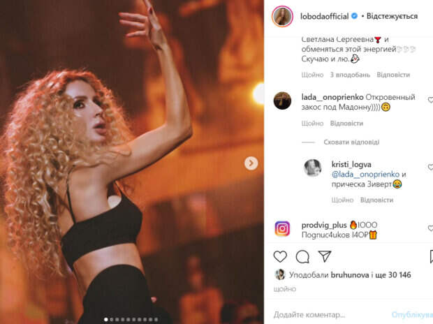 Из одежды на артистке был миниатюрный черный топик и юбка с завышенной талией. Лобода посветила своими упругостями в танце, сведя с ума своих поклонников. «Огонь, страсть эмоции - это то, что видите со сцены вы. Многочасовой труд и бессонные ночи - это то, что проходим мы, чтобы радовать вас вновь и вновь. Но как бы ни был сложен этот путь, выходя на сцену и видя восторг в ваших глазах, другой судьбы я себе не желаю», - написала Лобода. В комментариях красотке оставили массу приятных слов и комплиментов. Не обошлось и без сравнений. «Спасибо вам за ваш труд, за все что вы делаете для нас. Это бесценно», «Откровенный закос под Мадонну))», «Мы тоже очень соскучились...ждем момент, когда сможем танцевать вместе с Вами на большой сцене», «Света, ты невероятна!», «Вы наша муза», «Прям Шакира!», - пишут пользователи сети. Напомним, что уставшая Лобода показала закулисье съемок, раскрыв секрет о новой песне: "На поиски уходят...". Как сообщала Politeka, Лобода в страстном платье с прозрачными вставками показала, как зажигать на «Огоньке»: «Невероятно зрелищно». Также Politeka писала, что Лобода в белоснежном платье показала, как готовится с дочками встретить Новый год: "Завеяло теплом. ..".