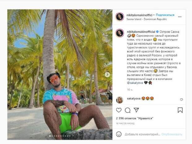 Сейчас звезда отдыхает на острове Саона, который принадлежит Доминиканской республике. Ломакин в новой публикации рассказал о своем отпуске. "Остров Саона. Однозначно самый красивый пляж, что я видел, мы приплыли туда за несколько часов до туристических групп и наслаждались всей этой красотой без фонового радио о великой России, у которой есть ядерное оружие, которое в случае войны всех разнесёт (просто в отеле, когда мы отдыхаем у басика, слышим это часто) Завтра мы вылетаем в Киев) отдых был прекрасным) ещё и в компании", - написал Никита. Фанаты поставили более двух тысяч лайков и написали комментарии: "Крутые фото", "очень круто", "Невероятно красивые картинки. Спасибо,что поделился с нами", "Красивая пара! Приятно было вас лицезреть! Побольше бы таких талантливых людей, как вы!!!", "Какая там красота, вода, Вы тоже красавцы)". Напомним, экс-бойфренд Мишель Андраде Ломакин в одних плавках хвастнул роскошным отдыхом А еще Politeka писала, что Ломакин нашел свое счастье после расставания с Мишель Андраде из "Орла и Решки" Также Politeka сообщала, что экс-участник "Голосу країни" Ломакин попал впросак перед Тиной Кароль