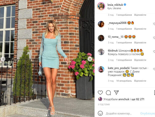 «Забежала поздравить с днем рождения Сергея Притулу @siriy_ua, но сфоткалась, увидела себя и поняла, что с ним будет следующее фото», - подписала фото звезда. В комментариях ей оставили массу восторженных слов. Отдельные комплименты заслужили загорелые ножки артистки. Как известно, рост Никитюк 180 сантиметров, поэтому она может похвастаться очень длинными ногами. «Это что за красота такая неземная?», «Божечки, какая же шикарная», «Выглядите невероятно красиво!», «Такие ноги даются лишь немногим», «О Боги, красота - страшная сила», «Похорошела, красотка», - пишут пользователи сети. Ранее мы писали, что Леся Никитюк поделилась пикантным фото из гримерки. Звезда показала себя при полном марафете. «Нос и губы сделала сама, ну а волосы доверяю профессионалам» - написала Никитюк под фото. Впрочем, не всем поклонникам пришлась по вкусу шутка звезды. Многие подумали, что речь идет о хирургических вмешательствах, а не о макияже. Стоит отметить, что губы выглядели так, будто их действительно увеличили, а линия контура была сильно изменена. Напомним, что Никитюк подкорректировала фигуру, натянув необычный корсет: "Уменьшает талию на...". Также Politeka писала, что Никитюк в мини-топе насмешила новым увлечением в собственном саду: "Перепробовала все. ..". А еще Politeka сообщала, что Никитюк неожиданно заговорила о свадьбе и выдала, почему отказалась от шоу "Холостячка": "Все уже готовы".