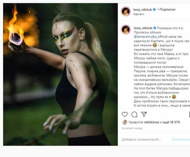 Об этом пишет Politeka.net со ссылкой на страничку знаменитости. "Рассказываю, кто я. На протяжении съемок меня так вдохновили Карпаты, что я пошла во все тяжкие и решила превратиться в Магуру. Все знают, кто такая Мавка, а от про Магуру почти никто, судя по прошлому посту. Магура - дочь громоизвергателя Паруна, тучная дева - прекрасная, крылатая, воинственная. Магура похожа на скандинавскую валькирию", - написала Леся. Фанаты поставили почти 20 тысяч лайков и написали комментарии: "Леся, супер-пупер", "Амазонка", "Вся в тату, куда собралась", "Леся эту фотографию можно вешать возле мешка с сахаром, чтобы дети сахар не воровали.", "Магура-фамилия моей школьной учительницы по физике, по описанию все совпадает", "Немножко страшно". Сообщалось, что украинская телеведущая, звезда тревел-шоу "Орел и решка", Леся Никитюк преобразилась до неузнаваемости ради экстравагантного образа. Леся Никитюк показала коллаж в стиле "до и после". На первом снимке она позирует в повседневнем виде, с легким макияжем на лице и простой прической. Напомним, шаловливая Никитюк покрутила упругим богатством в одном бикини А еще Politeka писала, что горячая Никитюк сверкнула дарами природы посреди ванной Также Politeka сообщала, что шаловливая Никитюк на фоне раздетого мужчины пустилась «во все тяжкие»
