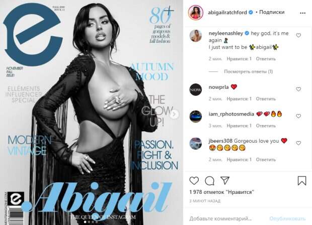 Американская модель Эбигейл Рэтчфорд покаказала первые кадры из обложки для модного глянца Спустя долгое время бездействия в социальной сети Инстаграм модель Эби Рэтчфорд решила поделиться жаркими кадрами, отснятыми специально для модного журнала. Девушка снялась сразу для обложки журнала Еlle и успела дать интервью, однако раскрывать детали работы над номером не спешит.