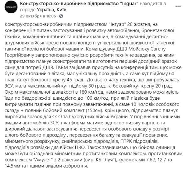 Вооруженные силы Украины могут получить новый уникальный бронеавтомобиль с хорошей проходимостью и скоростью Об этом сообщается на странице в Facebook конструкторско-производственного предприятия Inguar. Это предприятие презентовало концепт нового тактического бронеавтомобиля и опубликовало фото новой техники: данный вид транспорта будет предназначен для нужд десантно-штурмовых войск Украины.