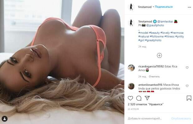 Так, Лекси принимает участие во многих фотосессиях и всегда старается поделиться лучшими кадрами оттуда. К примеру, девушка рекламирует белье известной марки и на фан-аккаунтах сразу появляются промо-фото с ее съемки. В оранжевом белье Кай показала себя в довольно смелых позах, ведь сеточка едва скрывала ее достоинства и сразу подчеркнула упругий бюст. Одно из фото было бурно оценено поклонниками: «Ты горишь, тебе так жарко